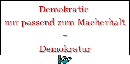 Ich selbst , mit meiner Geschichte , bin der beweis das wir keine Demokratie sind . Wie ihr mit mir gespielt habt und wie ihr mich in euer System wieder eingeordnet habt Ihr wisst was ihr seit und ich ... ( Für mich : Die letzte Frage im Leben ... . ) ist Beantwortet ( schon JETZT ) . Mich als Person konntet ihr auch an keiner Ratte ausprobiert haben und das ist doch für Psychologen auf eurer Seite und für mich